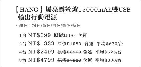商品訊息簡述: 平均每台最低只要600元起(含運)即可購得【HANG】爆亮露營燈15000mAh雙USB輸出行動電源1台/2台/4台/8台,顏色:粉色/黃色/白色/黑色/藍色。